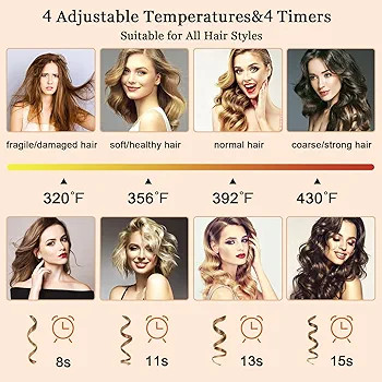 4 درجه حرارت و 3 تایمر برای همه مدل موها. از آنجایی که موهای همه افراد از نظر سختی و نوع متفاوت است، این بیگودی خودکار ارتقا یافته با 4 درجه حرارت مختلف از 320 درجه فارنهایت تا 430 درجه فارنهایت، متناسب با انواع مو طراحی شده است. زمان فر کردن خودکار 8 ثانیه / 10 ثانیه / 12 ثانیه می تواند به راحتی نیازهای مختلف حالت دادن به موهای شما را برآورده کند. این دستگاه دارای 1 غلتک مو، 1 شانه پلاستیکی، 2 گیره مو است که به شما کمک می کند تا با استفاده از این اتوی چرخان مدل های مختلف مو را به راحتی و راحت تر حالت دهید.