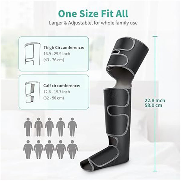 حالتهای ماساژ چندگانه و عملکرد حافظه: ماساژور پای ما ۶ حالت ماساژ ارائه میدهد که میتواند پاها و ساقهای شما را به طور جداگانه یا متناوب ماساژ دهد، با ۳ شدت هوا و ۳ حالت لرزش که به راحتی از طریق یک کنترلکننده دستی LCD قابل تنظیم هستند. میتوانید حالتهای ماساژ مورد نظر را آزادانه ترکیب کنید تا به آرامش کامل برای پاهای خسته و دردناک برسید. همچنین دارای یک عملکرد حافظه است که به طور خودکار تنظیمات قبلی ماساژ را برای استفاده بعدی بازیابی میکند. بند قابل تنظیم: یک سایز برای اکثر افراد: بند قابل تنظیم Velcro به راحتی میزان سفتی را تنظیم میکند و پوشش بهتری از کل پا را فراهم میکند و اثر ماساژ را به حداکثر میرساند. این دستگاه برای اکثر پاها مناسب است و محیط ساق پا تا ۱۹.۷ اینچ و محیط ران تا ۲۹.۹ اینچ است. توصیه میکنیم هنگام استفاده از این ماساژور پا با فشار هوا، ۳ تا ۴ انگشت فاصله بگذارید تا از کشیدگی جلوگیری شود.