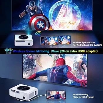 به لطف آخرین عملکرد وایفای، این ویدئو پروژکتور فول اچدی 1080p میتواند به صورت بیسیم با گوشیهای هوشمند IOS و اندروید که به عملکرد آینهسازی صفحه مجهز هستند، متصل شود. صفحه کوچک گوشی خود را به صورت بیسیم روی یک صفحه بزرگ نمایش دهید تا یک تجربه تماشای بازی غنی و باز را آغاز کنید. میتوانید ویدیوها/فیلمها را بدون تأخیر به صورت آنلاین تماشا کنید یا عکسهای ارزشمند موجود در گوشی خود را با خانواده خود به اشتراک بگذارید.