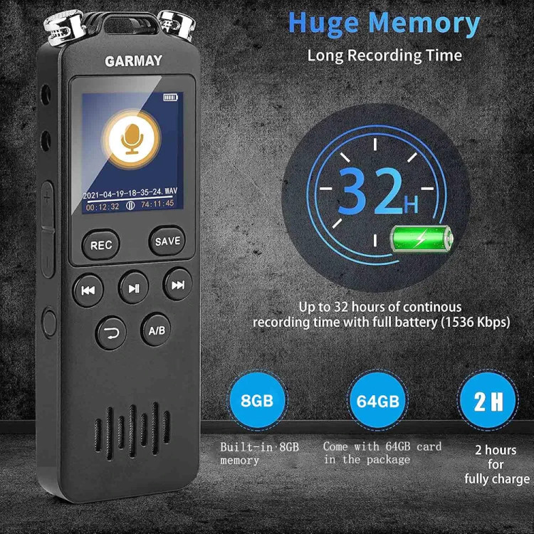 دستگاه ضبط صدای خبرنگاری پر قدرت با 8گیگابات حافظه داخلی و یک مموری 64 گیگابایت روی آن،برند GARMAY