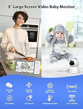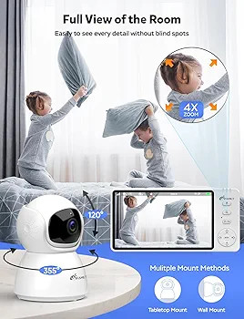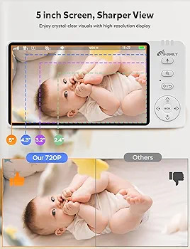 نظارت با دید گسترده - مانیتور ما بهترین دید را به شما میدهد. تا ۳۵۵ درجه و ۱۱۵ درجه به بالا و پایین میچرخد. از سوی دیگر، تصاویر با وضوح ۷۲۰ HD واضح و شفاف هستند. از ویدیوها و صداهای با کیفیت در زمان واقعی لذت ببرید که به شما کمک میکند با دانستن اینکه کودک شما در امان است، آرامش پیدا کنید. صفحه نمایش بزرگ ۵ اینچی تا ده برابر جزئیات و دقت بیشتری نسبت به مانیتورهای استاندارد دارد. ما با انتقال تمام فیدها از طریق کانال ۲.۴ گیگاهرتز با فناوری FHHS، حفظ حریم خصوصی شما را تضمین میکنیم.
