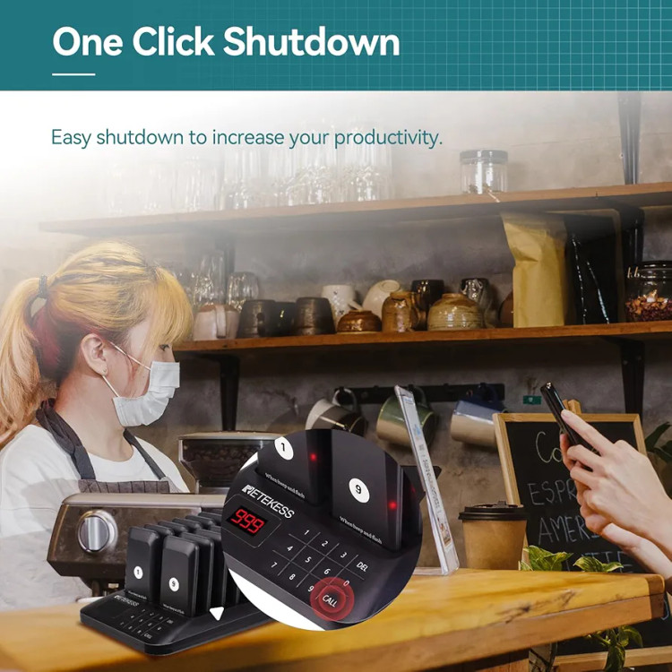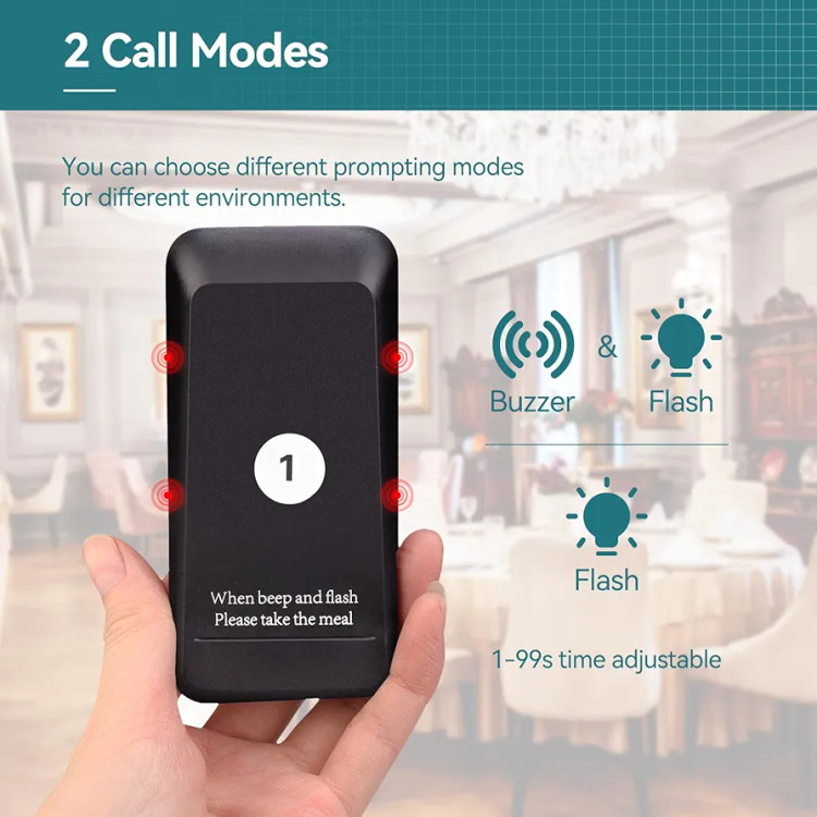 موثر؛ سیستم صف؛ 2 حالت تماس؛ صدای چشمک زن + بوق؛ فقط در مکانهای آرام چشمک میزند؛ پیشخدمت میتواند مدت زمان بوق را بین 1 تا 99 ثانیه تنظیم کند؛ سیستم پیجر رستوران همیشه بوق نمیزند.