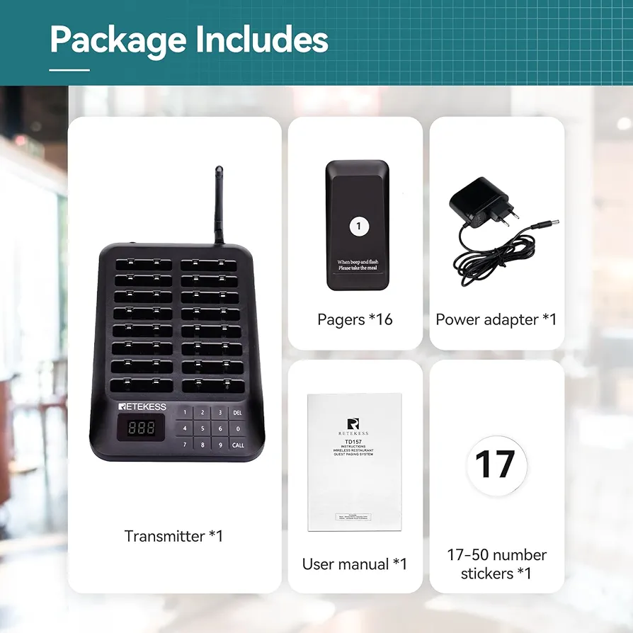 پیجر فراخوان 16 عددی با باتری 300 میلی آمپر برای هر رسیور،برند Retekess با برد 500 متر