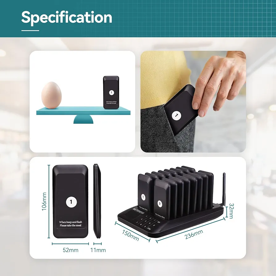 موثر؛ سیستم صف؛ 2 حالت تماس؛ صدای چشمک زن + بوق؛ فقط در مکانهای آرام چشمک میزند؛ پیشخدمت میتواند مدت زمان بوق را بین 1 تا 99 ثانیه تنظیم کند؛ سیستم پیجر رستوران همیشه بوق نمیزند.