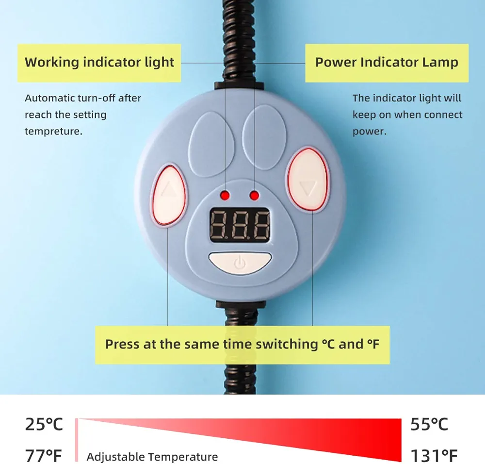 بازه دمای قابل تنظیم: ۲۵ تا ۵۵ درجه سانتیگراد / ۷۷ تا ۱۳۱ درجه فارنهایت (بازه دمای مناسب برای حیوانات خانگی). دارای نمایشگر دوحالته سانتیگراد و فارنهایت است. تخت گرمکن سگ با ترموستات دارای نشانگر LED بوده و بهراحتی میتوانید دما را مشاهده و تنظیم کنید.