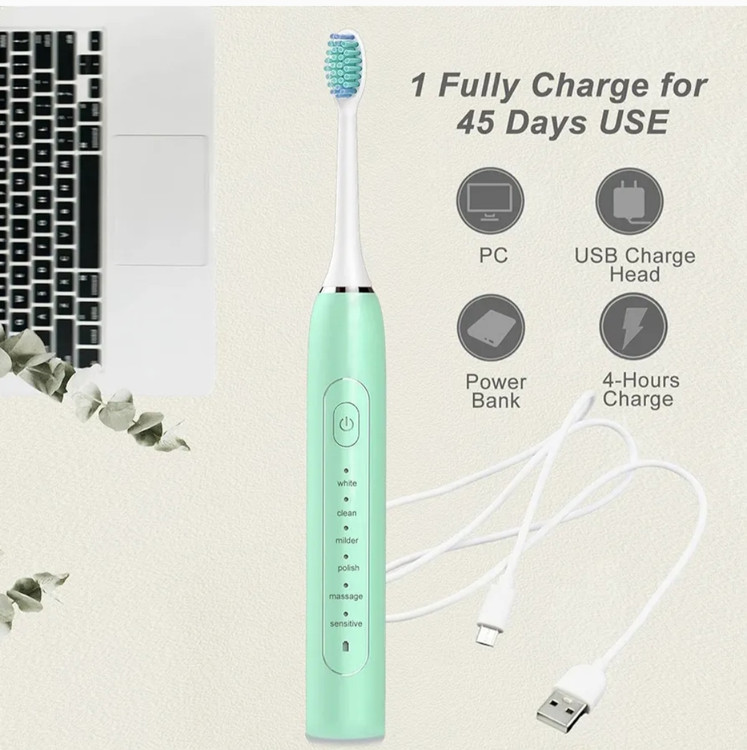 【عمر باتری】 - 4 ساعت شارژ کامل می تواند بیش از 45 روز استفاده کند. عمر باتری طولانی و طراحی سبک وزن این مسواک برقی را برای بزرگسالان راحت تر و قابل حمل تر می کند. این مسواک دارای کابل شارژ USB برای شارژ در هر مکانی است که می تواند با پورت USB، پاور بانک، کامپیوتر و سایر منابع تغذیه سازگار باشد. کت و شلوار برای استفاده در سفر.