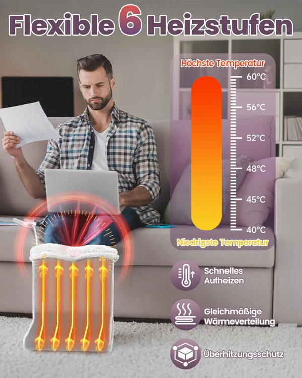 تنظیمات گرمای قابل تنظیم برای راحتی فردی: گرمکن پای ما دارای شش تنظیم گرما است که به شما امکان میدهد گرما را از ملایم ۴۰ درجه سانتیگراد تا گرم ۶۰ درجه سانتیگراد تنظیم کنید. این طراحی قابل تنظیم به این معنی است که میتوانید سطح گرمای مناسب را متناسب با نیازهای خود پیدا کنید. چه به گرمای سریع نیاز داشته باشید و چه به گرمای طولانی مدت، چهار تنظیم تایمر (۲/۴/۶/۸ ساعت) به شما امکان میدهد مدت زمان را کنترل کنید و هم راحتی و هم بهرهوری انرژی را تضمین کنید. این گرمکن برای گرم نگه داشتن شما در طول یک روز کاری طولانی یا دادن یک عصر آرامشبخش در خانه عالی است. مواد سازگار با پوست برای راحتی ماندگار: گرمکن پای ما که از جنس فلانل و مخمل تنفسپذیر ساخته شده است، راحتی طولانیمدتی را فراهم میکند و از گرم شدن بیش از حد جلوگیری میکند. جنس نرم و سازگار با پوست، حتی برای افرادی که پوست حساسی دارند، تجربهای دلپذیر و ابر مانند را تضمین میکند. خاصیت رطوبتگیری آن تضمین میکند که پاهای شما حتی در طول استفاده طولانیمدت خشک بمانند. چه در حال استراحت با کتاب باشید، چه در حال تماشای تلویزیون یا کار در خانه، این گرمکن پا تضمین میکند که پاهای شما در تمام طول روز گرم و راحت بمانند، بدون اینکه خیلی گرم یا گرفته شوند.