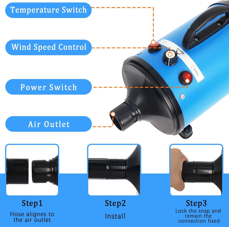 بدنه فلزی بادوام: این سشوار سگ دارای قدرت بالای ۴.۵ اسب بخار/۳۲۰۰ وات است. برخلاف سایر سشوارهای پلاستیکی، سشوار سگ ما دارای بدنه فلزی محکمی است که برای دوام ساخته شده است. این امر دوام طولانی مدت را تضمین میکند و از آسیب آسان جلوگیری میکند.