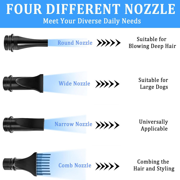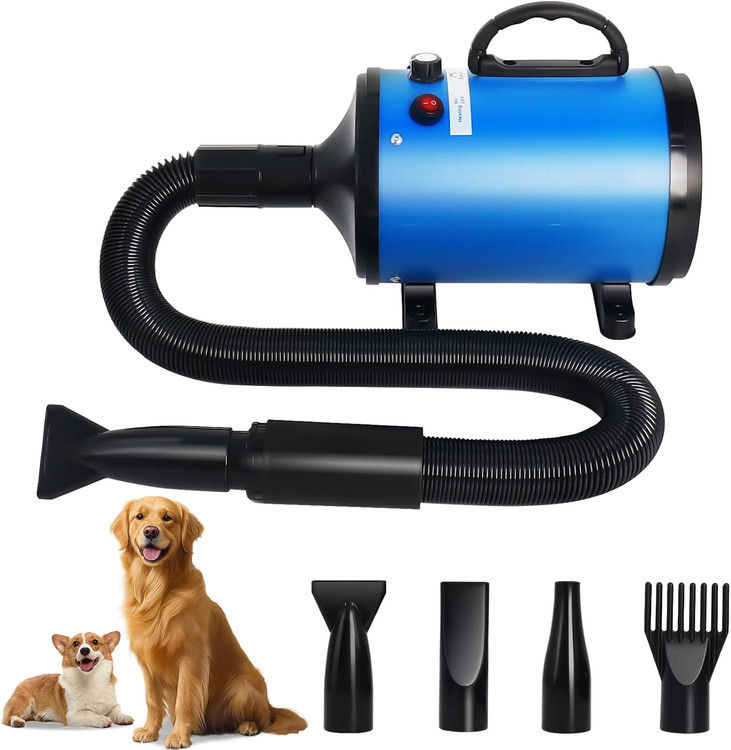 خشک کن، سشوار سگ Gekufa برای سگهای بزرگ، سشوارهای حیوانات خانگی با سرعت بالا ۴.۳ اسب بخار ۳۲۰۰ وات با بخاری برای اصلاح، دستگاه خشک کن حیوانات خانگی با قابلیت تنظیم دمای چرخش با ۴ نازل و ۱ پوشش سر پشمی (آبی،مشکی،صورتی)